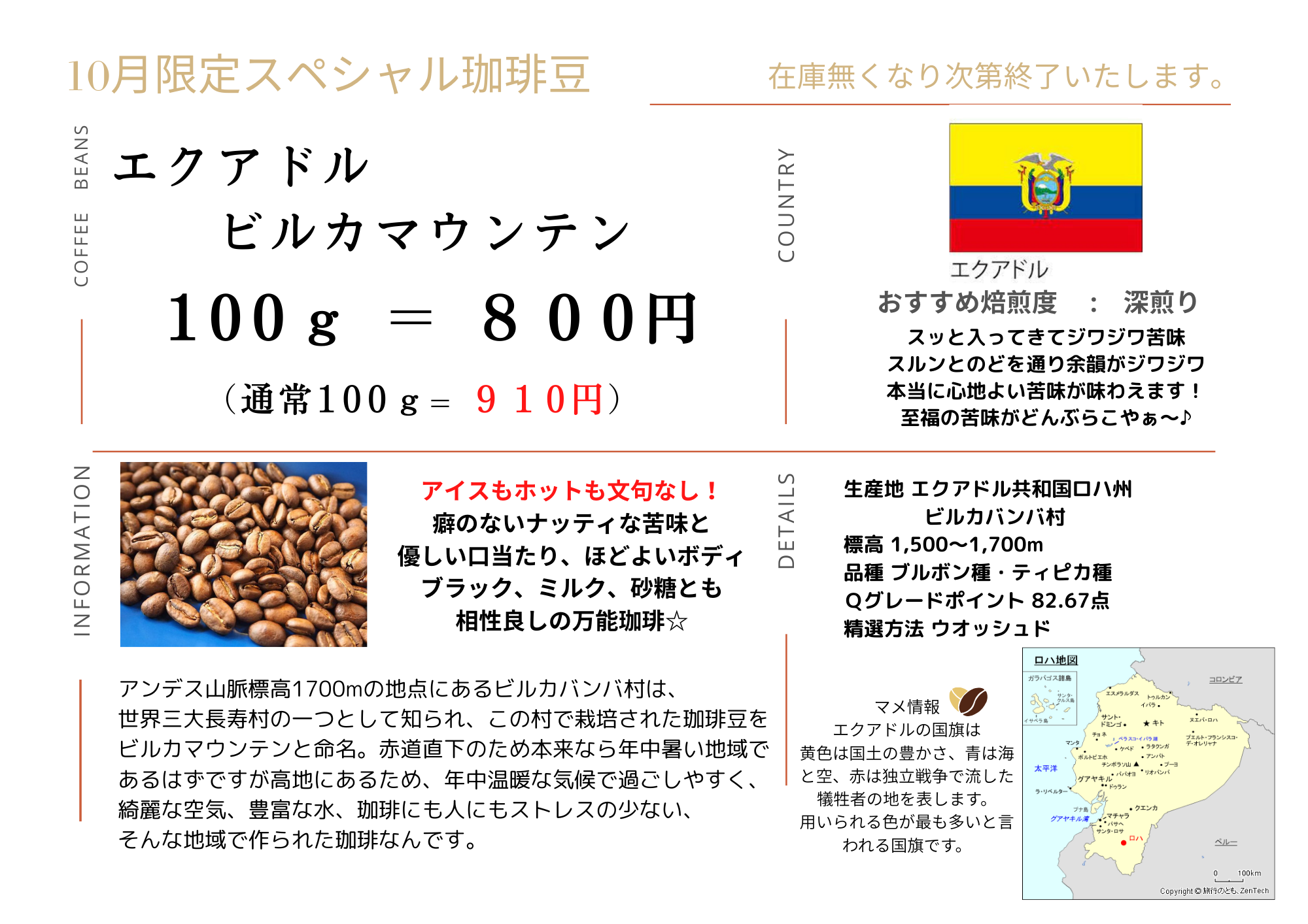 2025年10月01日 | 10月の限定豆は【エクアドル ビルカマウンテン】深煎り 100g=800円です! アンデス山脈標高1700mの地点にあるビルカバンバ村の珈琲豆。赤道直下のため本来なら年中暑い地域であるはずですが高地にあるため、年中温暖な気候で過ごしやすく、綺麗な空気、豊富な水、珈琲にも人にもストレスの少ない、そんな地域で作られた珈琲です。 そんな温和な地域で取れた珈琲豆をあえて深煎りに!深煎りにしても温和な地域のマイルドな特性は損なわれず、優しい口当たりから苦味がじんわり滲みだし、ごくりと飲み込めば苦味の奥に甘みを伴う余韻が心地よく長く続きます。 くどくない苦味はアイスでもホットでも楽しめますよ♪ ※在庫が無くなり次第終了となります。 |