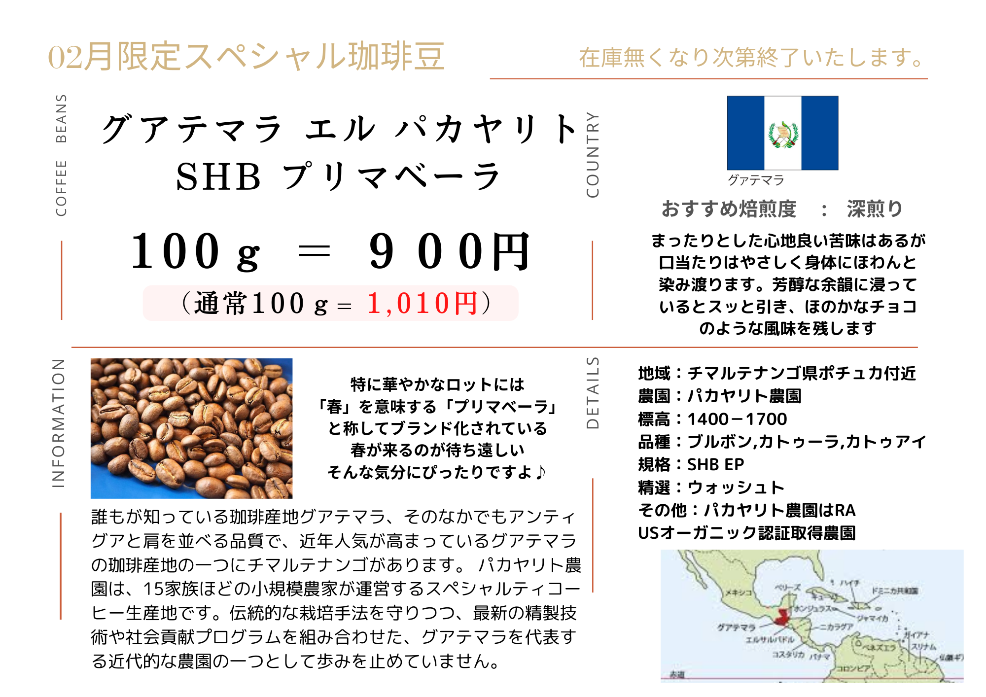 2026年02月01日 | 2月の限定豆は【グアテマラ エルパカヤリトSHBプリマベーラ/ウォッシュト】深煎り 100g=900円です! 変わり種ばかりが出てくると思いましたか?超メジャー産地グアテマラからの参戦ですよ。 グアテマラが当店から無くなってかれこれ経ちますが、いまだに言われるグアテマラの声。。。 高いから避けてたのですが出します!出しますよぉ~!グアテマラと言っても広いので皆様のお好みなのかどうか!? 今回当店では敢えての深煎りに仕上げました。まったりとした心地よい苦味はあるが、口当たりは優しく 身体にふわんと染み渡ります。芳醇な余韻はスッと消えほのかなチョコのような風味を残していきますよ! ぜひお試しくださいませ♪ ※在庫が無くなり次第終了です。 |